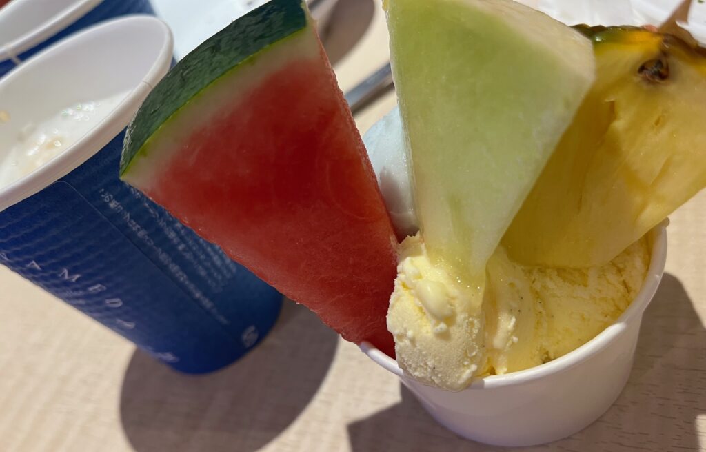 この量を完食したあと、フルーツ、アイスクリーム、カプチーノ。