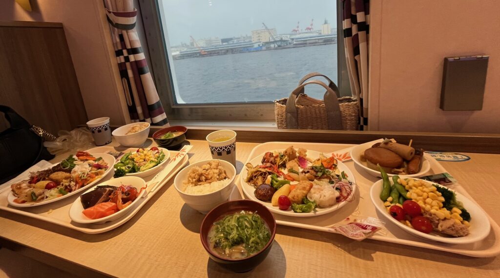 出発のさんふらわあターミナル(大阪)はショッピングや食事もできるようでしたが、着いたのがぎりぎりで、そこからシャトルバスに乗って第2ターミナルまで行くと、お土産を買うところもなく焦りました。(船内に売店があり、そこでお土産などを買えます。)