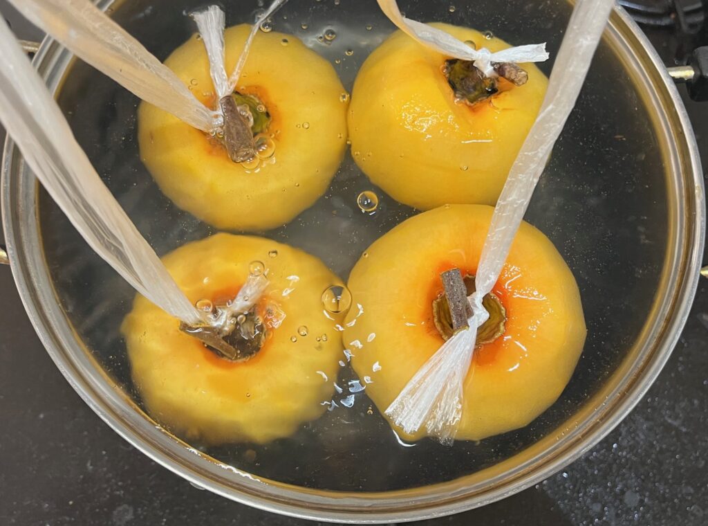 4. 全部の柿をくぐらせるため、鍋は火にかけ軽く沸騰させ続ける。(熱湯・やけど注意!)