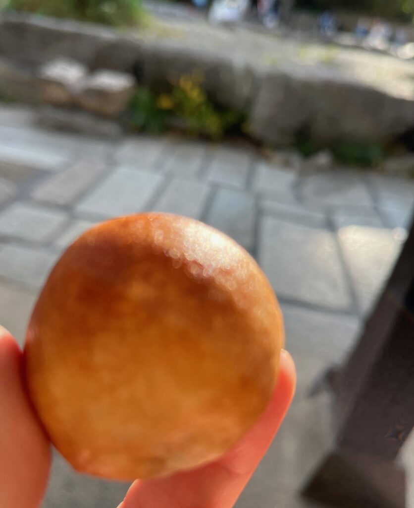 八幡堀の近くにある1800年以上の歴史を誇る神社、日牟禮八幡宮に参拝し、ちょっと一息、境内近くにある「たねや 日牟禮乃舎」で、焼きたてのつぶら餅をいただきました。