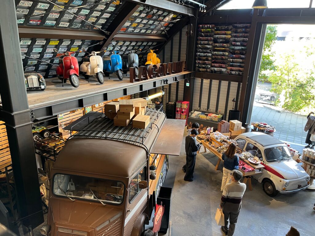 パンやマカロンが販売されているギフトショップには、2階建てのロンドンバスやルパン三世の作中でもおなじみのフィアットも置かれていて、楽しい空間になっています。